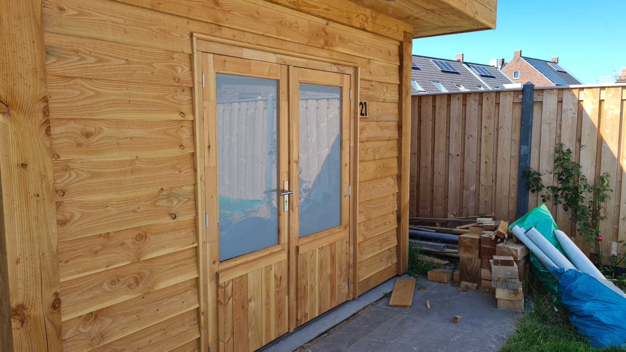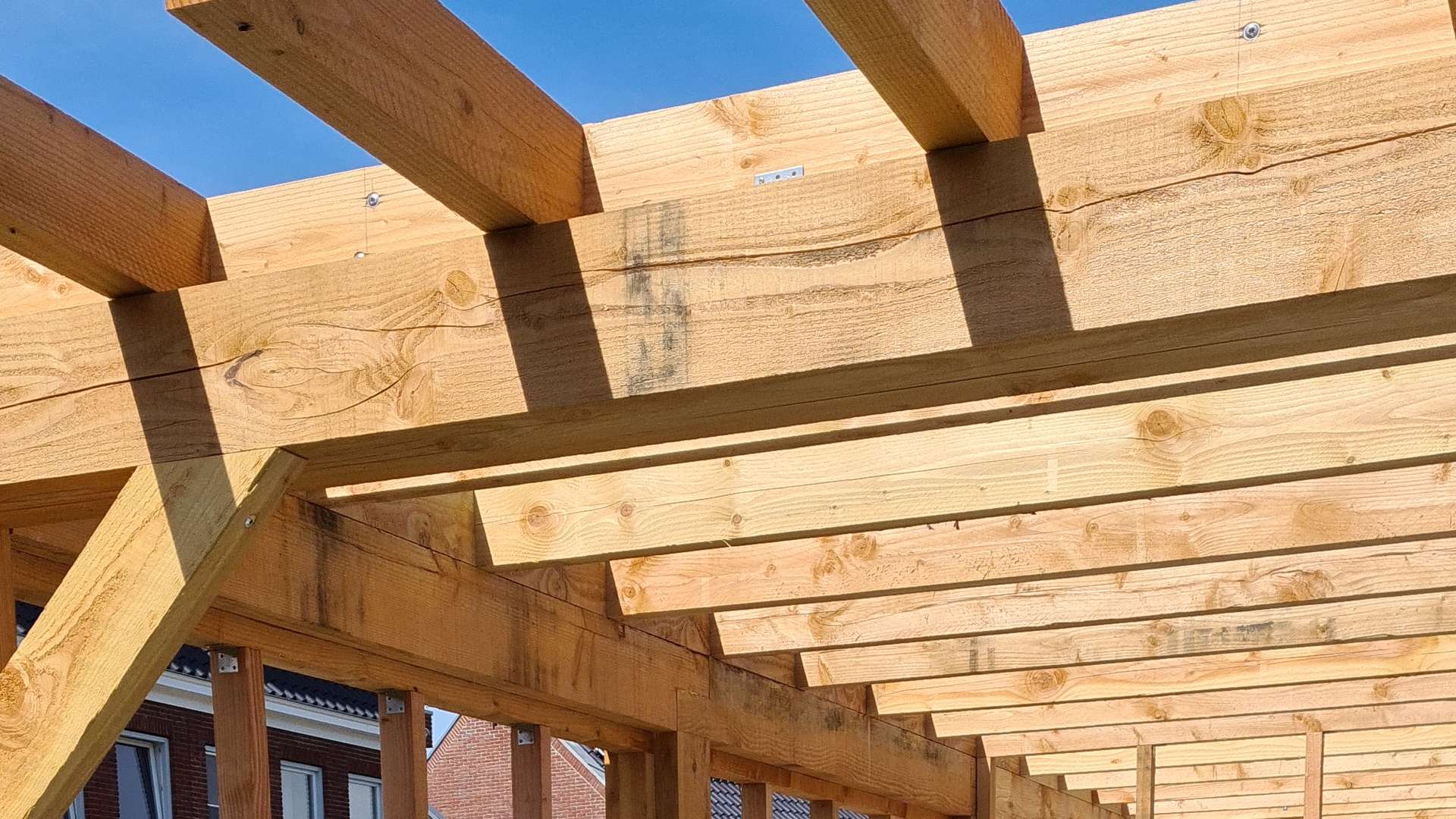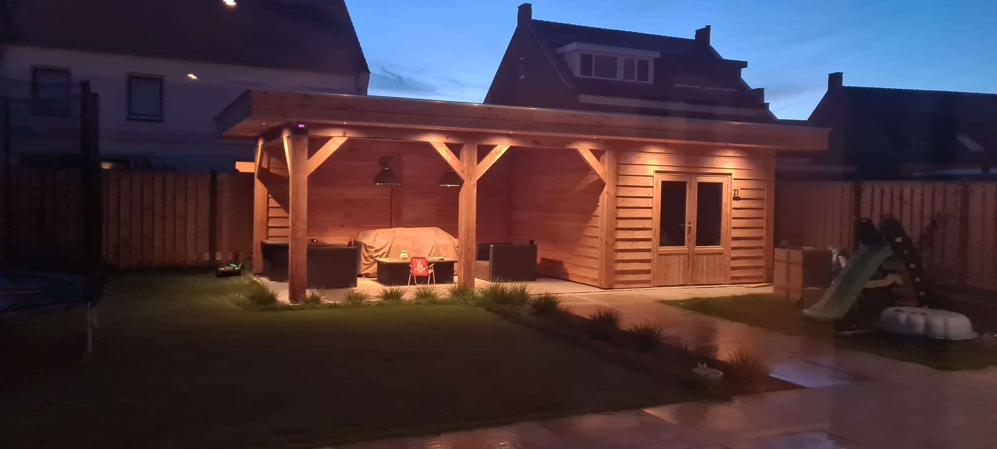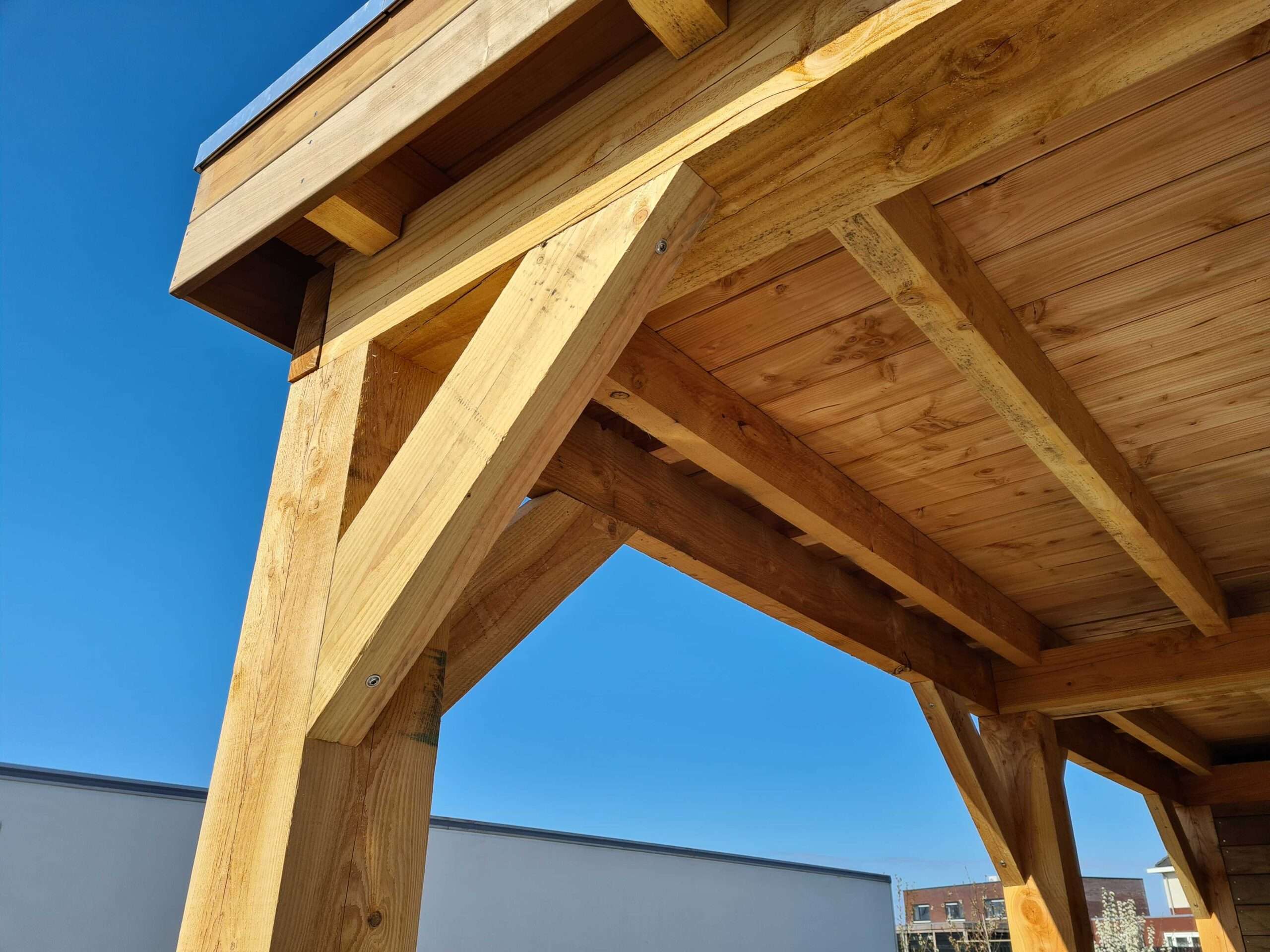 Das Dach ist mit (PIR) Isolationsmaterial versehen, wodurch in Zukunft auch die Möglichkeit besteht, die Überdachung mit einer Glastrennwand zu schließen. Die Dachneigung wird allein durch die Isolierplatten gewährleistet, wodurch der gesamte Bau einfacher und schöner (keine schrägen Linien) wird.