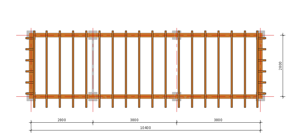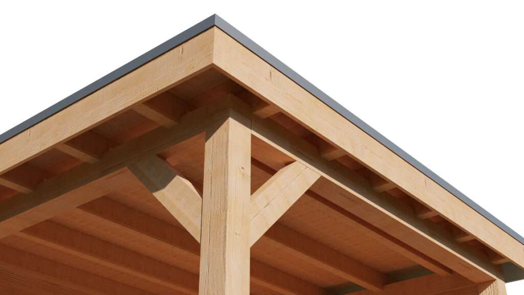 Die Haupttragstruktur besteht aus 200x200mm Balken und Stützen, wodurch sie ein besonders robustes Aussehen erhält und Durchbiegungen vermieden werden.