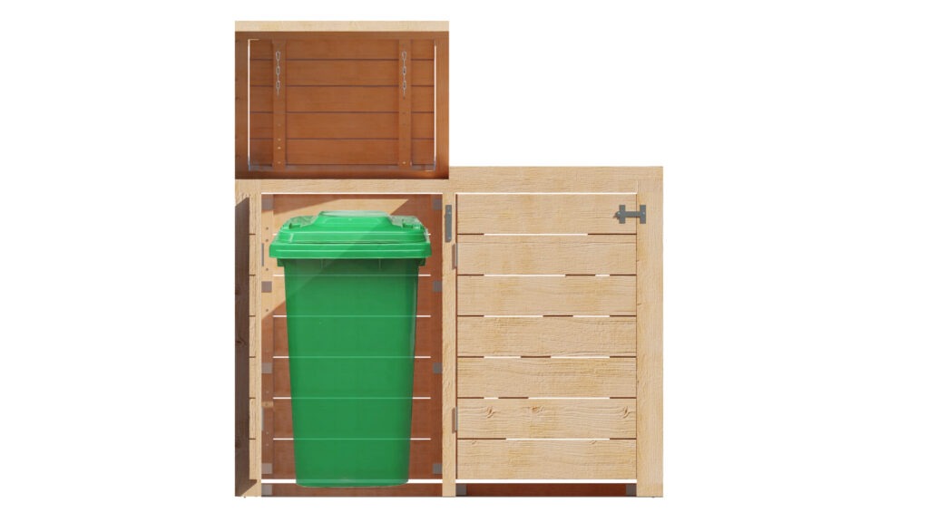 Der Umbau ist so konzipiert, dass von außen kaum Schrauben sichtbar sind, was zu einem sehr glatten Aussehen führt. Wenn du die Klappe des Mülltonnenbox öffnest, öffnet sich auch der Deckel des Mülltonnen mittels Ketten.